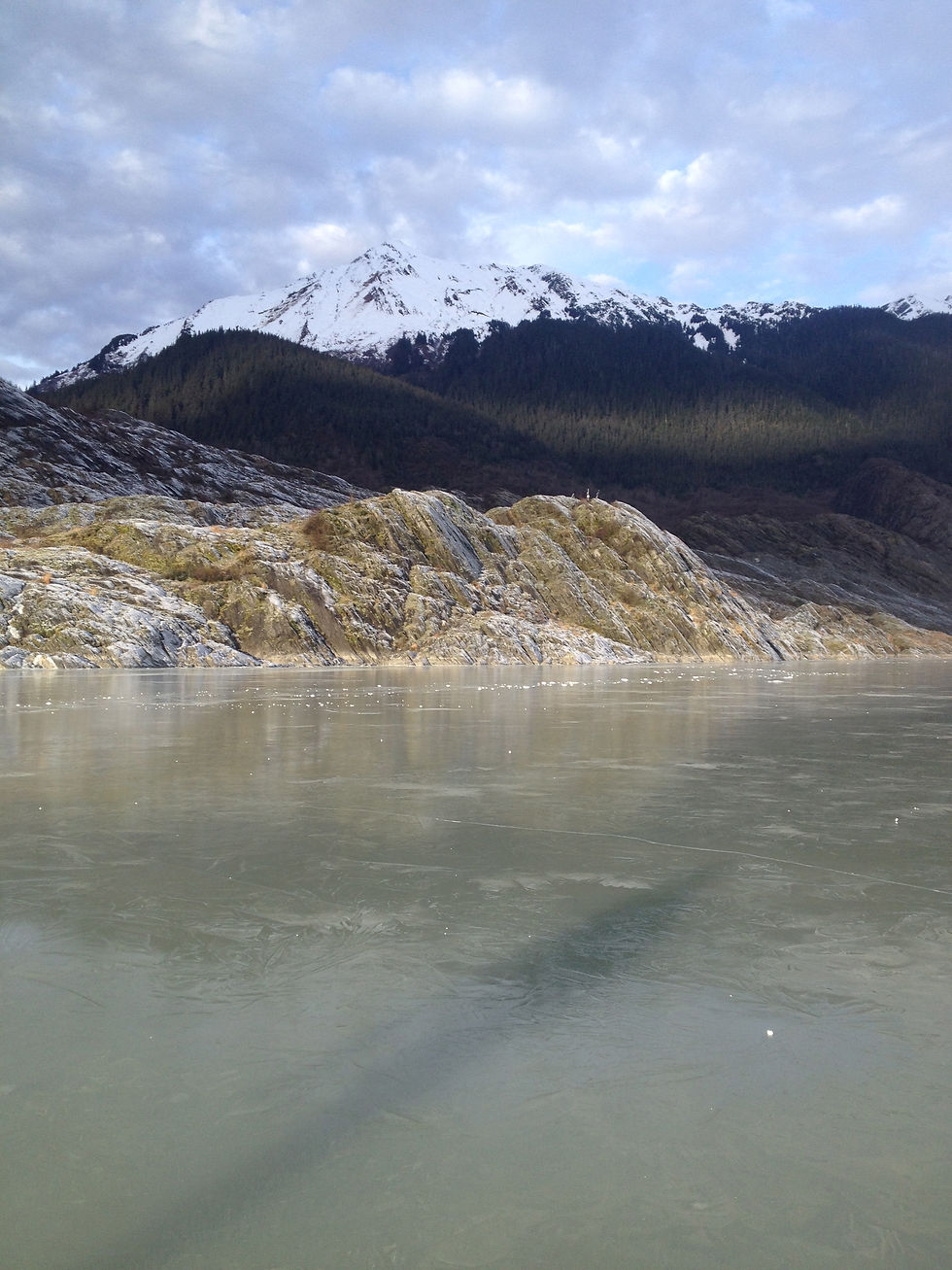 1. Not So Frozen Lake: The Mendenhall Lake had just frozen over so we decided to spend 20-30 minutes crossing it to get to the glacier. Pretty treacherous. As we were nearing the ice-berg formations, the ice began to thin and become less stable. So in order to get off, we had to go up towards shore and climb the slippery iced rocks. However, the ice was especially crackly at this part. We didn't know what to do. Until Mitchell decided to sacrifice himself and cross over on his stomach to distribute the weight. Before he did so, we had to come up with a rescue plan just in case. It felt like hours waiting for him to cross, but despite the sounds and water bubbles underneath the frozen glass, he survived. Which meant that we could all cross. Packs and all. 2. Slippery Slope: Once getting off the lake, we still had a ways to hike to get to the actual glacier. This entailed us climbing through uneven terrain (which normally I'm fine with but this time wasn't) that was covered in ice and frost. I slipped, fell, and slid one too many times to still somehow be alive. We also had to cross a creek with rushing water, but figured it was okay because it was frozen over at the narrowest point. Well, I went in and was soggy (but luckily that part happened at the end).